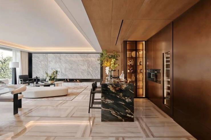 全盘类一梯一户设置,电梯厅与客厅采用同款石材通铺,让空间私属体验更进一步。