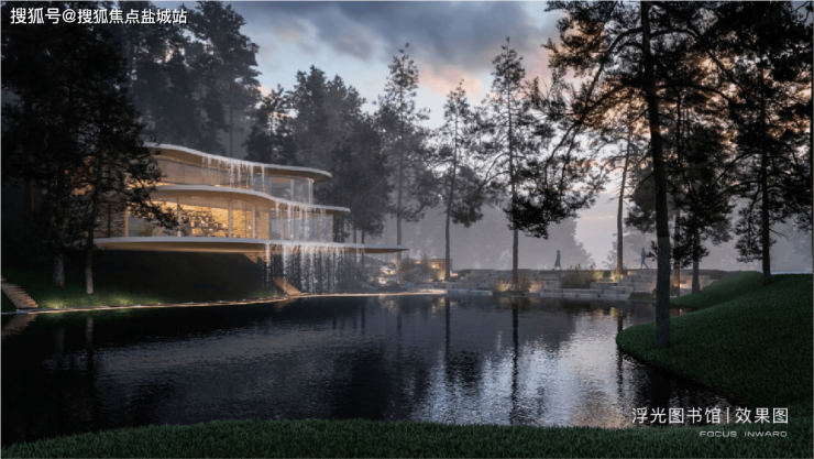 还有隐于湖边山体中的[浮光图书馆],整体以当代玻璃艺术建造,一道瀑帘流下,给人以豁然开朗之感;