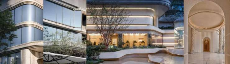 【生辉之金】:香槟金金属流线、手工密拼弧形金属板,外立面石材铝板采用干挂工艺,流动恒久的华贵。