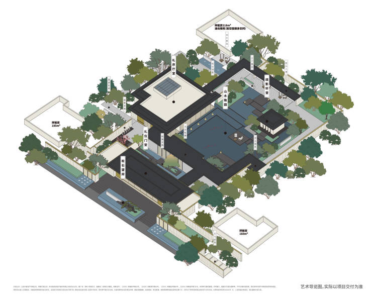 一进礼序门堂,二进琉璃光院,三进山水隐园,四进明堂水镜,五进静谧花园,再现世家门庭之礼制。