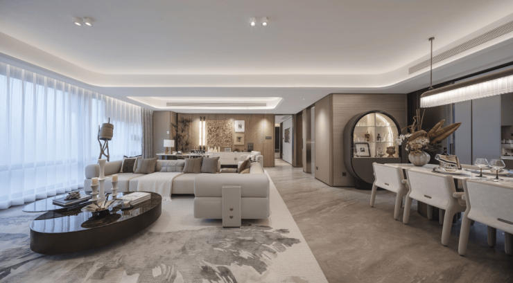 流畅弧线衔接客厅天花顶与墙面,在设计手法加持下,赋予“对称与非对称”的柔和美,采用岩板电视背景墙(180㎡户型为石材),并严选大金、百朗、菲斯曼三大件,全维升华人的「改善体感」。