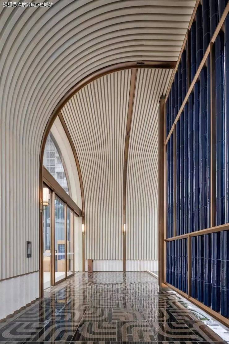 从门仪到家门口,近人尺度的空间感受一气呵成。塔楼基座的设计延续主入口的半拱廊元素,形成舒展连续的檐下空间。门厅两侧的屏风格栅,延续主入口皇家蓝釉面陶筒双层错缝拼装,釉面肌理细腻尊贵。