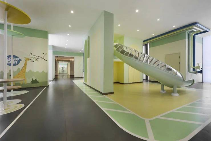 主题架空层,专为小业主们打造,划分绘画区、阅读区以及滑滑梯、传声筒等主题游戏区。