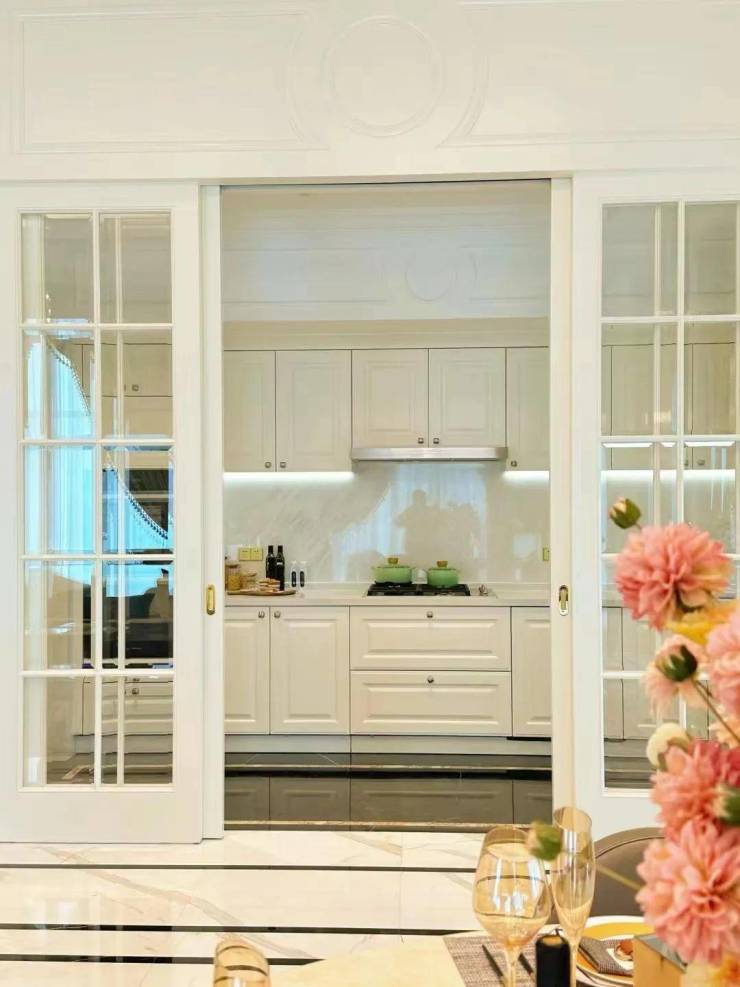 客厅地面采用“凡尔赛宫”地花穿透拼精湛工艺,所有石材都是选用意大利鱼肚白大理石。