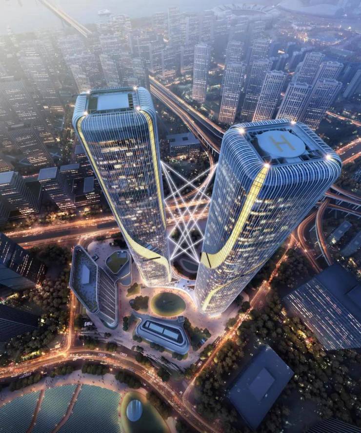 项目邀请国际知名大师团队EID ARCH首席建筑师姜平,通过双子超塔的建筑形象将智慧之门以抽象化的形式呈现出来。作为地块南侧城市轴线的终端, 双子塔的门户形象回应基地周边的城市空间关系,与整体的城市设计相协调。