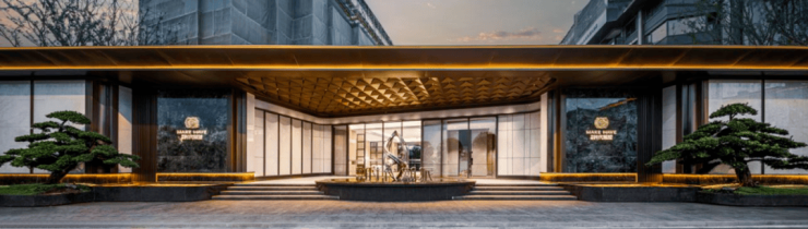 社区主入口设计酒店式环岛归家,辅以活力四溢的涌泉水景,营造出更尊崇的归家仪式感。入户门厅以弧形悬浮顶棚为特色,为业主带来柔和温润的视觉体验,预约归家体验。