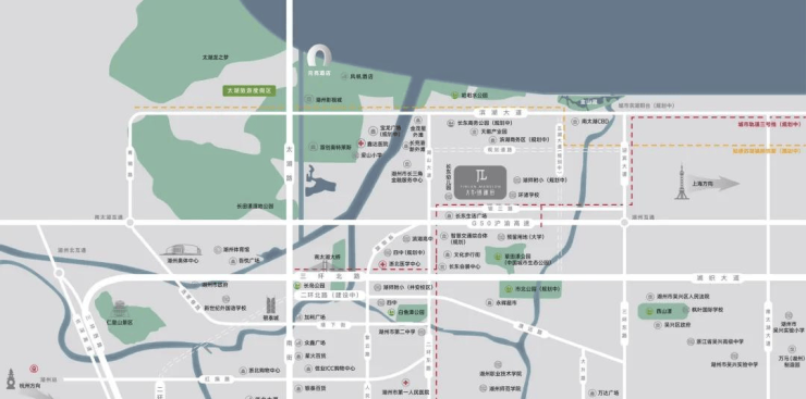 项目周边规划有南太湖318米CBD(在建)、新传媒中心(在建)、湖州市长三角金融服务中心(在建)、南太湖金融街(工商银行、农业银行、建设银行、交通银行、浦发银行、兴业银行、宁波银行、嘉兴银行、湖州银行、吴兴农商银行等10多家金融机构签署入驻)、金茂星外滩(规划中)等。