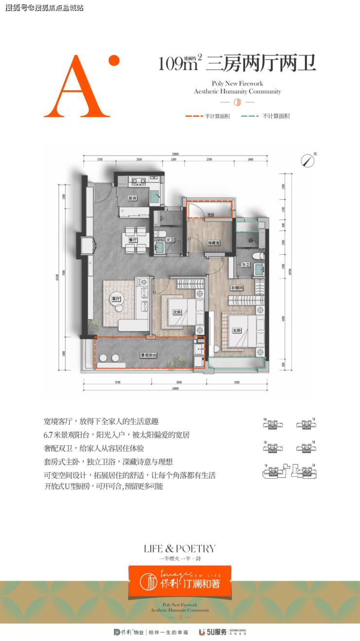 项目户型设计合理,平均得房率高,同等面积多一房,且真正做到了南北通透格局。提供建面约 109㎡三房两厅两卫、120㎡和 138㎡四房两厅两卫三个面积段,满足不同购房群体的需求。大尺度景观阳台、双阳台、可变空间、套房式主卧等前沿设计,让业主享受舒适的居住体验。