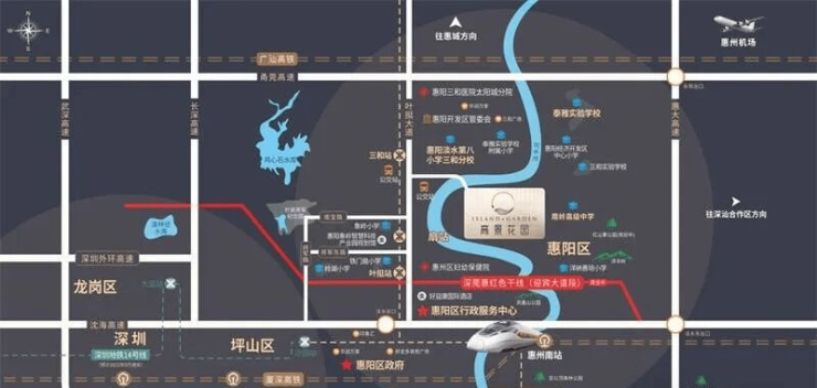 高景花园位于惠阳政务区,紧邻“丰”字交通最核心干道——叶挺大道,厦深高铁惠州南站在侧,深圳地铁14号线(预计2022年10月通车)即将开通,未来惠州1号线(规划中)铁扇门站就在家门口,惠大高速无缝衔接深圳、惠城、惠湾。