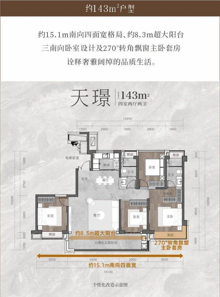 超大面宽户型:户型设计突破常规,建面约120-172㎡的户型均采用大面宽设计,如120㎡户型南向面宽达12.9米,143㎡户型南向面宽达15.9米,172㎡户型南向面宽达17.7米,搭配270°转角飘窗或拐角飘窗,最大化采光与视野,空间尺度堪比大平层,颠覆传统户型想象。