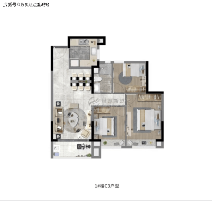 建面约108㎡3房2厅2卫,做到了三开间朝南+双阳台设计+主卧套房设计+南北通透,该户型得房率非常高。