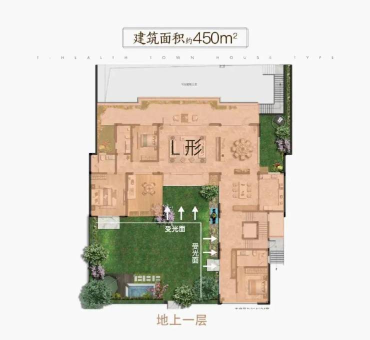 其中建面约450㎡高阶户型,采用L型围合布局,庭院面积最大可达约250㎡,院落与一线翡翠湖湖景连成一片,犹如居住在庄园中。