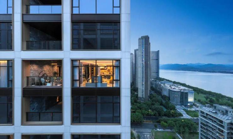 建筑以“金镶玉”为灵感,白色铝板镶嵌香槟金窗框,搭配LOW-E双层中空玻璃幕墙,形成油画框般的立面美学。每户标配约40㎡U型空中花园,可定制私人泳池、森系庭院或星空酒廊,270°全景落地窗将钱江潮涌、西湖群山与城市灯火尽收眼底。