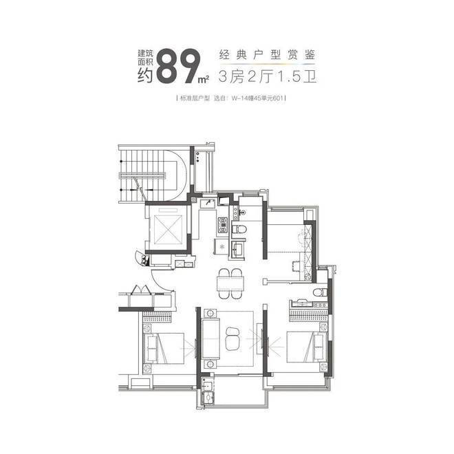 所以虽然是约89㎡的紧凑型3房,但这个户型还是有空间做了一个1.5卫的设计,保证了主人的私密空间,也避免了早高峰用厕的尴尬。