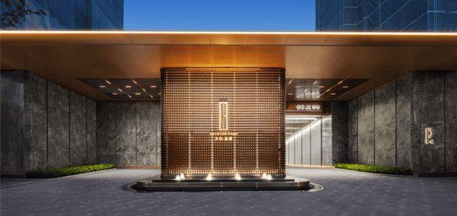 地上大堂,单元门厅的雨棚采用香槟金的弧面铝板、立面干挂爱马仕灰蜂窝岩板,岩板上嵌入专属楼栋号,单元门两侧的弧线段金属采用定制模具加工。