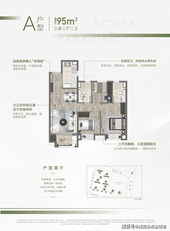 约95㎡的三房,南北通透,全明设计,三开间朝南,户型方正。