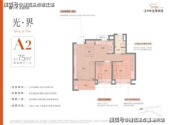 户型设计上,保利虹桥和颂,品质改善为出发点,设计“私属、至臻、尊崇”三大产品理念,臻奢建面约75㎡户型,三开间朝南,阳光与清风为伴,玄关+餐边柜+飘窗,全能收纳,卫浴三分离,干湿有别,奢阔餐客厅一体,空间明朗,动线流畅。