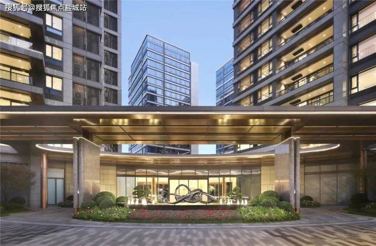 步入项目,迎接你的便是足够阔绰的门头:中央海浪造型的雕塑簇拥着小景,形成一个“小环岛”;嵌有灯带的铝板门檐搭配石材立柱,给人一种“酒店式门仪”的尊崇感。