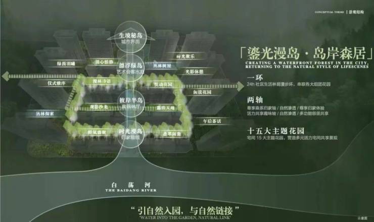 以“山水聚场”理念,规划“一环两轴十五园”景观布局,将水岸、岛屿、森林、花园、树屋作为园林节点,形成“行在景中、坐在岛中、游在林中、意在境中”的美学表达,营造出沉浸式山水活力场域。