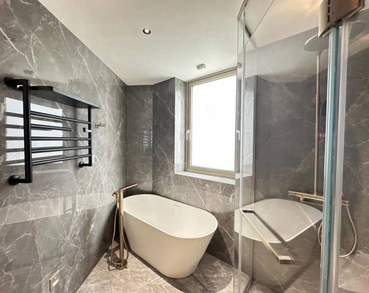 卫浴空间打造也是满满的豪宅品质感,卫生间均配备了智能马桶和电加热毛巾架、淋浴房、花洒均是科勒精选系列,主卫为香槟金色,细微之处见真章!