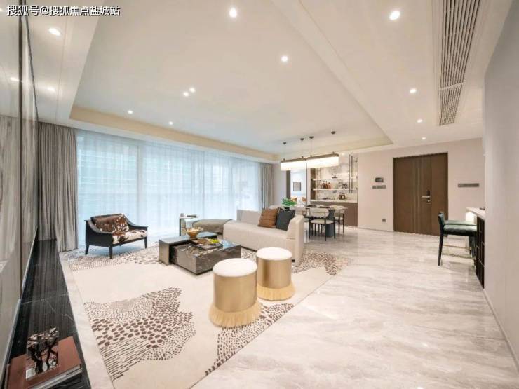 以建面约188㎡的五房为例,四开间朝南的大面宽的排布,南向开间超过15米,7.3米的超大餐客厅外接跑道式阳台,搭配巨大的落地窗,既有三代同堂的其乐融融、亲朋好友欢聚的温馨浪漫,又有客厅、茶室、餐厅等等无数种空间的个人组合,生活充满无限想象。精装修上,芬迪白岩板的客厅背景墙,中厨外的实用岛台等全是交标,品质感直接拉满。