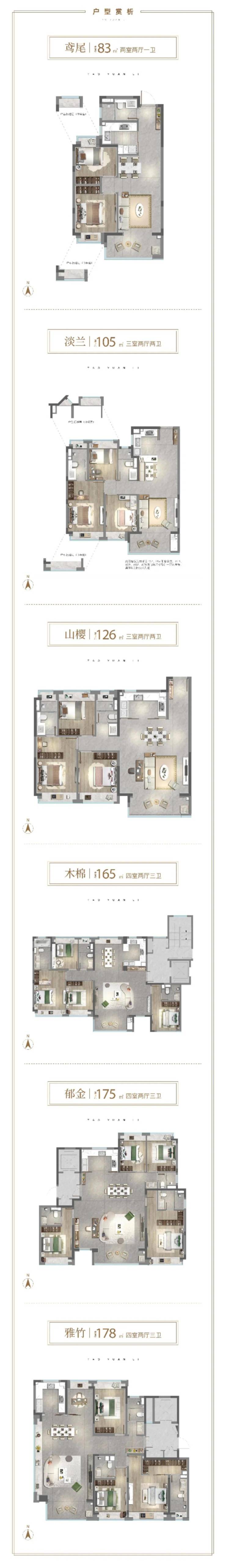 户型说辞:小区有 10 幢住宅及 2 幢商业组成,分为南北两个地块,累计可售商品房为 604 套,户型 从两房至四房,可满足二人世界到三口之家和三代同堂的居住需求,首开房源为南地块 168套。 南地块共计有4幢住宅,168套房源 :B1、B2两幢为11层的166㎡4/2/3户型,共44套,为 一梯两户电梯双开门设计;B3幢为16层的106㎡3/2/2户型,西侧单元为保障房;B5幢为17层的 106㎡3/2/2户型,共124套,为一梯两户设计。 北地块共计6幢住宅,436套房源:A1幢为16层的83㎡2/2/1户型,共计148套;A2、A3、 A7幢为17层的106㎡+126㎡户型,其中A2、A7幢西单元、A3幢东单元为126㎡3/2/2户型,共48 套;其余的全部为106㎡3/2/2户型,A6幢为17层的106㎡3/2/2户型,共208套,均为一梯两户设 计;A5幢为17层的175、178㎡4/2/3户型(东单元:175㎡;西单元:178㎡),共32套,为一 梯一户设计;全部为精装交付