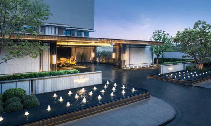 约420㎡的半岛酒店式车马院,含景墙宽约100米、高约6.3米的礼序大门,构成立体的归家空间尽显气派。古铜色铝板重顶、如折叠玉石屏风的三面白世贸波纹石材景墙与福鼎黑晶石地面承托起社区的门面。