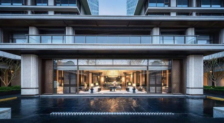 车马院以上海半岛酒店作为灵感来源,在设计方面采用了海鸥丽晶酒店同款的接待门,凸显出尊贵的大家门厅风范;营造社区归家的玄关,下挂式的星空顶、艺术雕塑、迎宾叠水以及范思哲黑背景墙相互映衬。