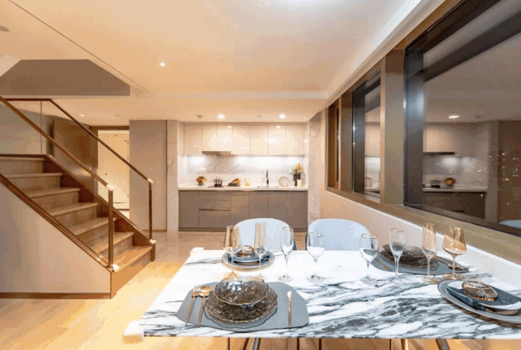 一楼为客餐厅及厨房等公共区域,一体化设计,尤其是餐厅部分为挑高设计,整个内部的空间更从容。客厅和主卧的精致背景墙也是交付标准,厨电及卫浴也都采用方太、科勒等一线大牌,再加上随处可见的收纳空间,既保证了居住品质,又贴近实际生活需求。
