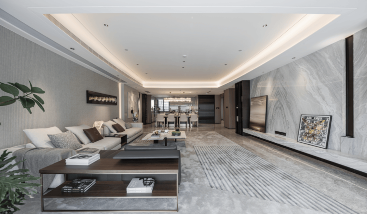 建筑面积约315m²的四房,叶飞老师设计,一梯一户,推开约1.5m的子母装甲门,是巨大的约6.3m×12m的餐客厅,欧努灰地面映着冰川白奢石,温润雅致,八人位餐桌岛台配着晶莹的酒柜,欢乐闲适,电动窗开启的阳光绿植,是轻松假日。