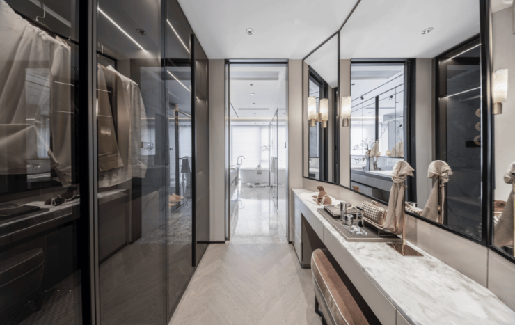 进入主卧,透明的玻璃衣柜,当季最新款的首饰包包礼服像是橱窗的仪式,双洄游的卫生间和一整扇梳妆台,则是度假酒店的趣味,没有一个女生对此有抵抗力。