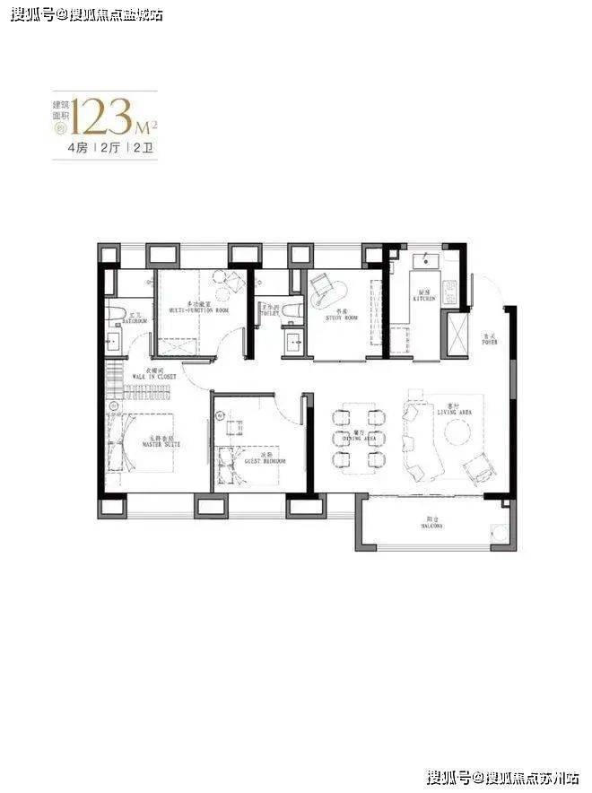 123㎡四房两厅两卫,厅更6.3米面宽,可以扩展成多功能空间。