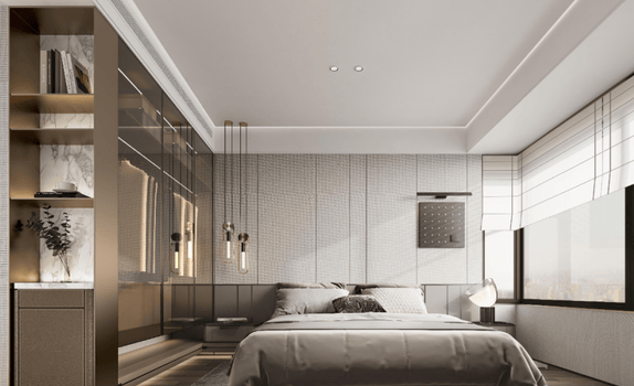 主卧是家最温馨的空间,皮质背景墙、转角窗、弧形吊顶使空间活力与温馨兼具,整体设计简洁明了,不造作、不浮夸、以此表达空间自身的态度。