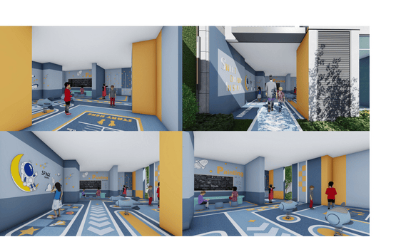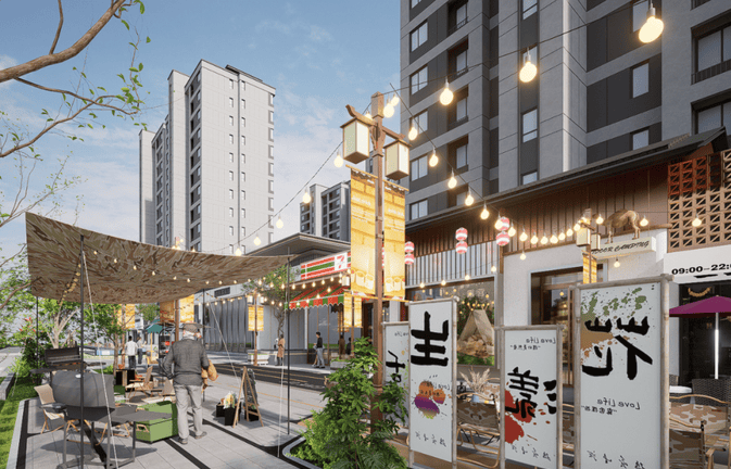 效果图 跳跃而有节奏的线条打破传统线性住区沿街商业的空间,在街区适当的位置规划外摆、活动区域,根据不同区域的业态与商业氛围,给出了详尽的立面、景观、美陈建议,涵盖了外立面风格、场地功能、空间尺度、景观器械样式、家具道具选型建议、组合形式,甚至材质、颜色等等,将悦享集的室内外场景整体统筹规划,消弭了边界。