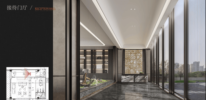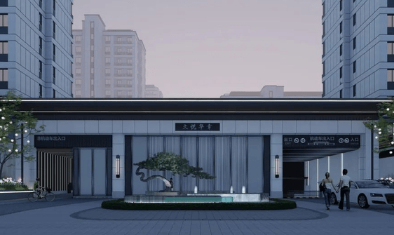 开门见山,迎宾蓄客,新中式建筑体量作为尊崇府门,横向舒展的形体,展现典雅东方古韵。