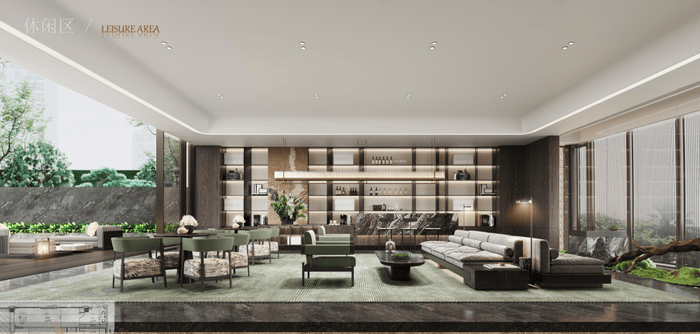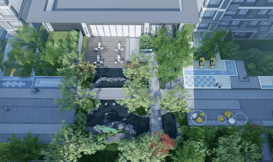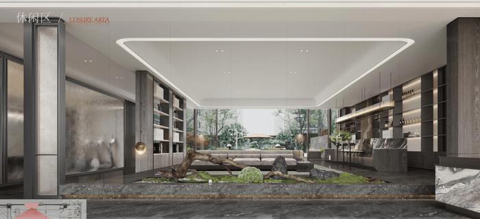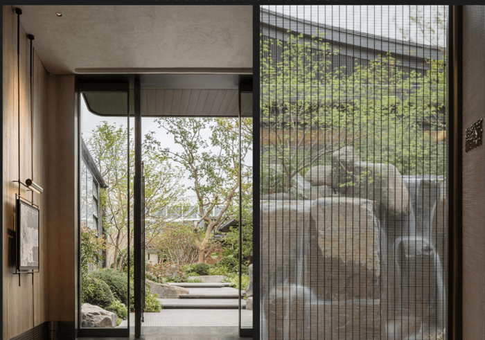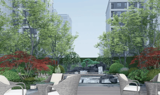 门厅外延平台是未来客户在园区会客赏景、对话古今的诗意生活写照之地。潺潺流水,眼中有景,耳中有音,握一杯茶,独坐或与家人和朋友品茗、谈心,享受一场心灵的音乐会,寻得一处精神的休憩领地。