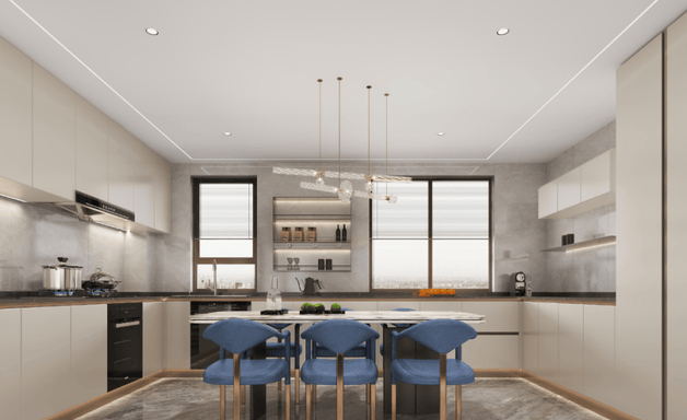 餐厨的一体化设计,超长的操作台面,米灰色的烤漆橱柜,无不彰显着品质生活的追求。餐椅采用克莱因的蓝,硬朗的皮质与客厅氛围相互映衬,复古中流露出家人共同进餐的温馨。