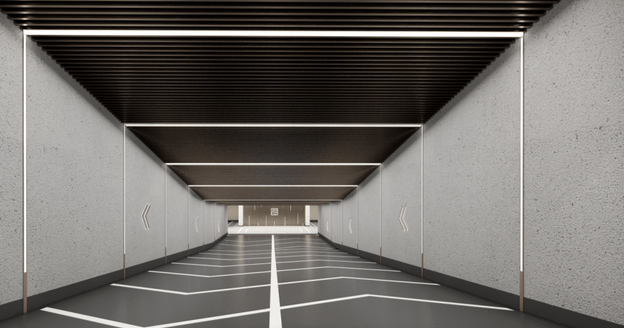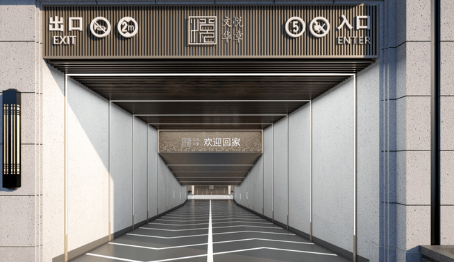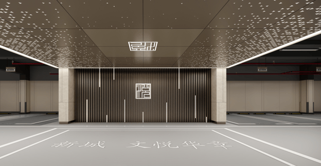地库坡道及地库玄关进行专项精装设计,结合亮化灯带形成序列感动线。坡道端头设置地库仪式玄关,结合星空吊顶及项目案名,增加车型归家的仪式感与精致度,让地库不再是冰冷阴暗的空间,而是温暖舒适明亮的暖心地库。