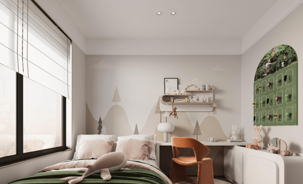 新奇有趣的森系主题儿童房承载着孩子对于未知的无穷好奇,小主人迫不及待地回到家里,像着童话里的主人公一样,在房间展开一场关于森林的冒险。依窗而设的榻榻米+L型书桌设计对于小户型的儿童房来说非常实用。同时,书桌形成的围合空间也给孩子带来更多的代入感和安全感。