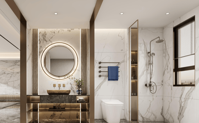 酒店化的卫生间设计,干湿分离,功能完善,细节满满。同时,圆形镜面在灰色大理石及铜色金属共同烘托下,呈现了现代低奢的生活品质。