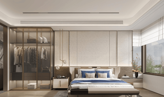 开阔的主卧空间,介于自在与随性之间。独立的衣帽间柜体收纳高效且精致简洁,小型水吧台亦为生活带来一份惬意。色彩搭配和家具选型的契合展现空间的品质生活,自然光透过窗户洒进房间,慵懒的休息氛围萦绕心头。