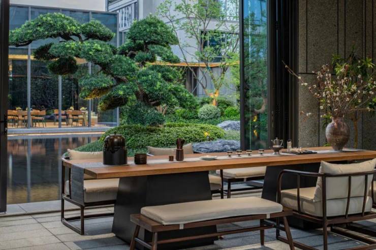 穿过大堂,一条风雨连廊蜿蜒伸展,如同一条守护的纽带,无论风雨变换,始终为归家的旅人提供一片温馨的避风港。二进院落的设计,巧妙融合了江南园林的精髓,四水归堂,藏风聚气,不仅寓意着财富与团圆的双重美满,更让居者在归家的瞬间,便能感受到那份来自自然的宁静与和谐。
