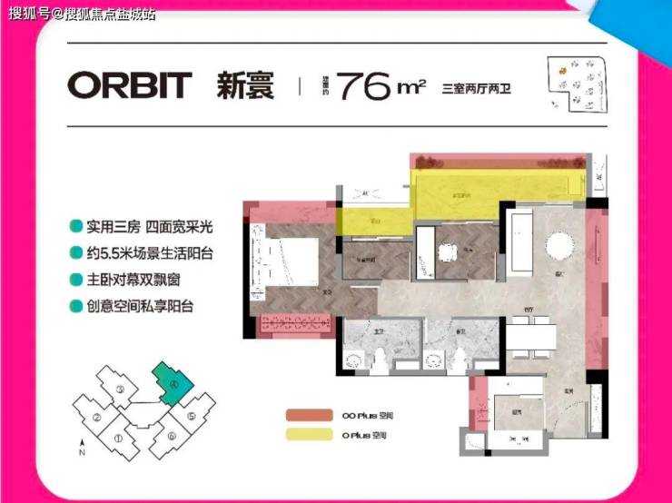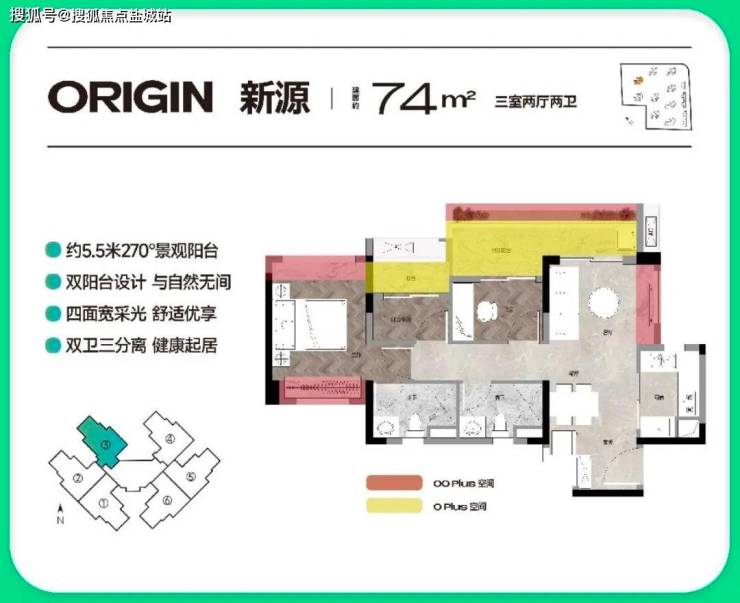 户型设计合理:74方/76方三房做到真两卫,小户型也能给生活最大尊重,早上起床不用抢厕所;四面宽采光,5.5米超大阳台,餐客厅飘窗赠送,采光更优。
