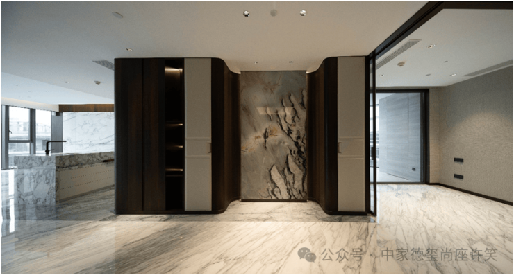 材质臻华:甄选意大利卡拉拉白、保罗灰、巴西天宝石等8国珍稀奢石,全域铺陈。地下大堂宝家蓝、劳家黑金,奠定奢境基调。