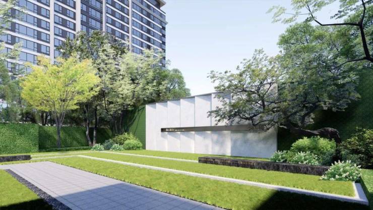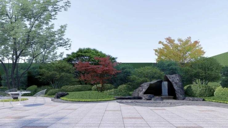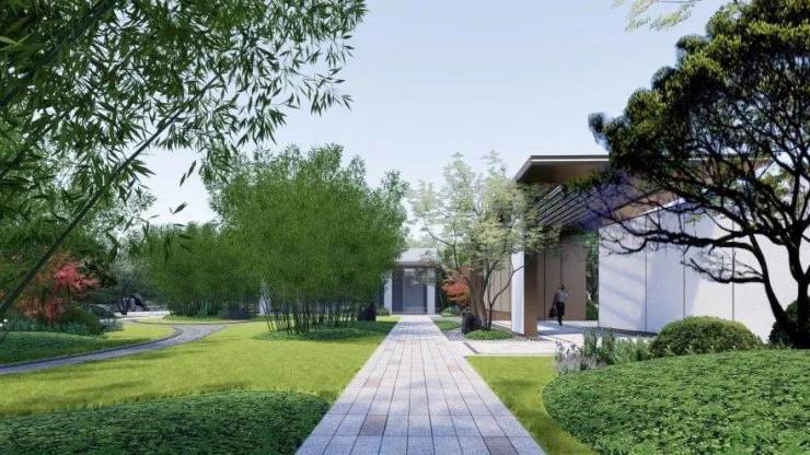 我们以板岩竖拼出一条流动的曲线,仿佛河流般流淌于林屿之中,并利用曲线流动产生的进退关系与行进的视线相呼应,配置竹林绿岛,在小空间中利用框景、障景、漏景等传统园林的设计手法进行设计,形成一幅幅具有现代江南园林感受的空间画面,使来访者在游园中感受惬意与惊喜。