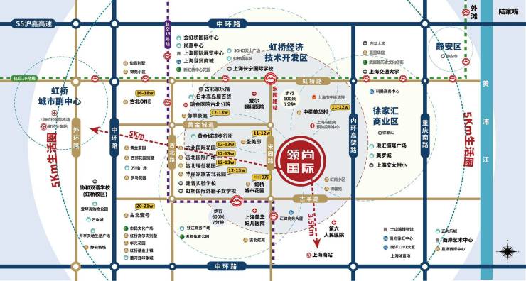 轨交:项目距离10号线宋园路约600米,四站直达上海动物园;7站直达距离虹桥火车站;距离15号线姚虹路约800米,一站至娄山关路换乘2号线;