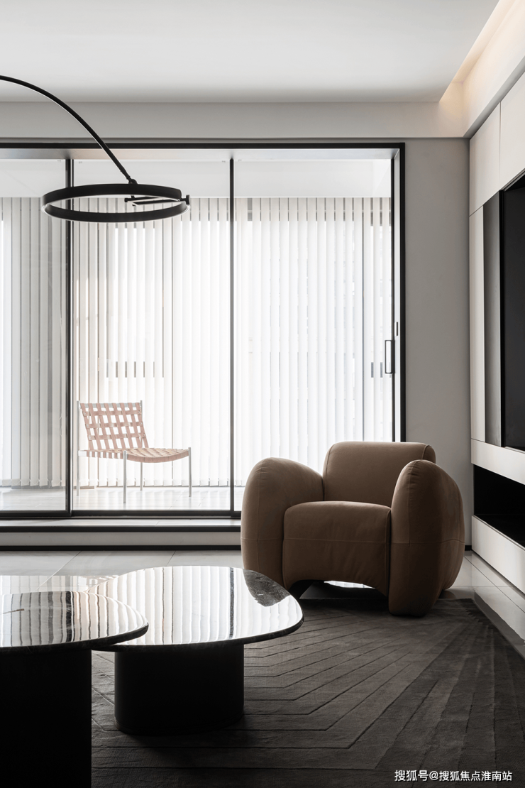 垂直百叶窗将透过大落地窗照进家中的光线均匀切开,营造出光影的效果,既保证了充足的光线又有效保证了隐私性。