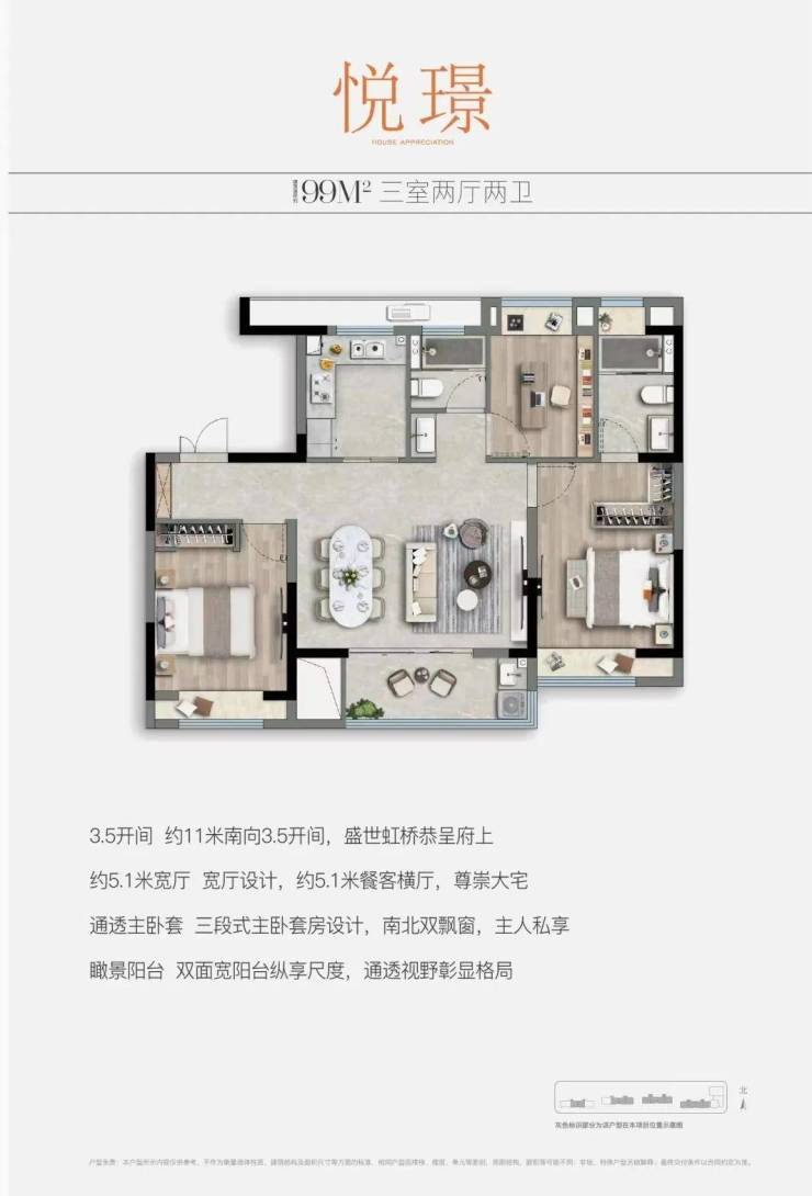 户型点评:百平左右的户型打造三室很常见,但能同时做到南向3.5开间属实难得;餐客横厅更是达到了约5.1米的宽度设计,大幅提升了生活舒适度、以及实用性;主卧套房,涵盖步入式衣帽间与独立卫浴,南向自带飘窗,缔造尊贵私密私享。