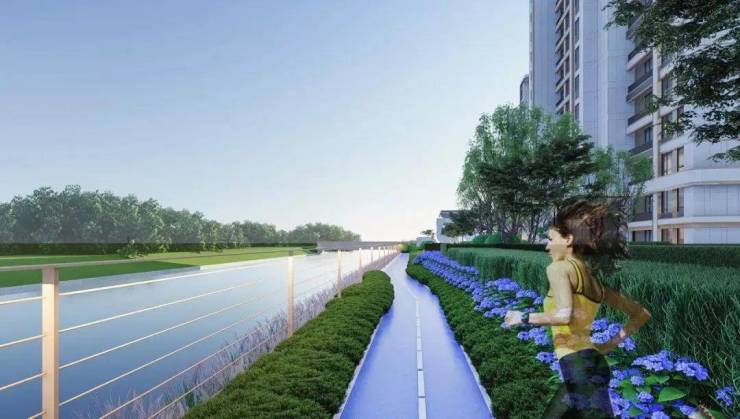 北侧沿河岸打开视野面,构建滨水健康漫步廊道,亲水水岸吧台、健康步道、观景卡座、休闲平台,于此漫步自然的水岸,感悟大虹桥闲适的时光。