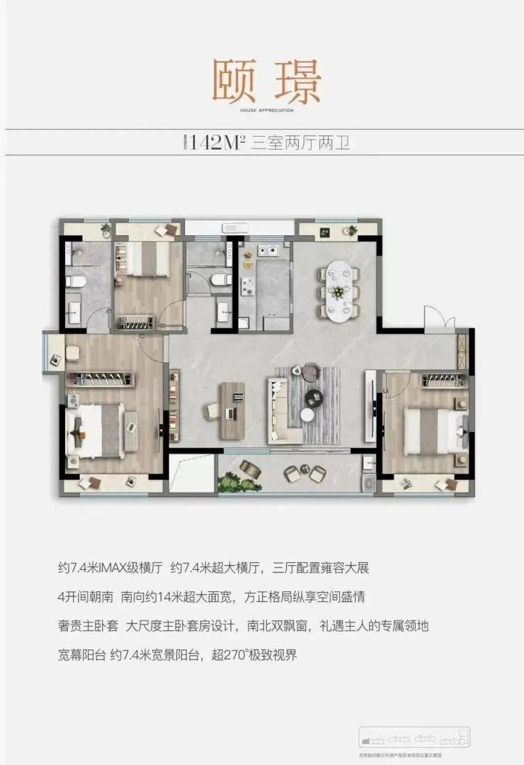 户型点评:两条天然河道从中建颐璟臺北侧和西侧蜿蜒流过,而140平这个户型最大的特点就是增加西侧开窗设计,整个房型三面采光,不但提升房间采光通风,更能完美拥有西侧北侧双河视野,一线河景尽收眼底;同时,约7.4米的大尺度横厅,除了拥有更大的采光面外,也可以根据需求自主隔离功能房空间。